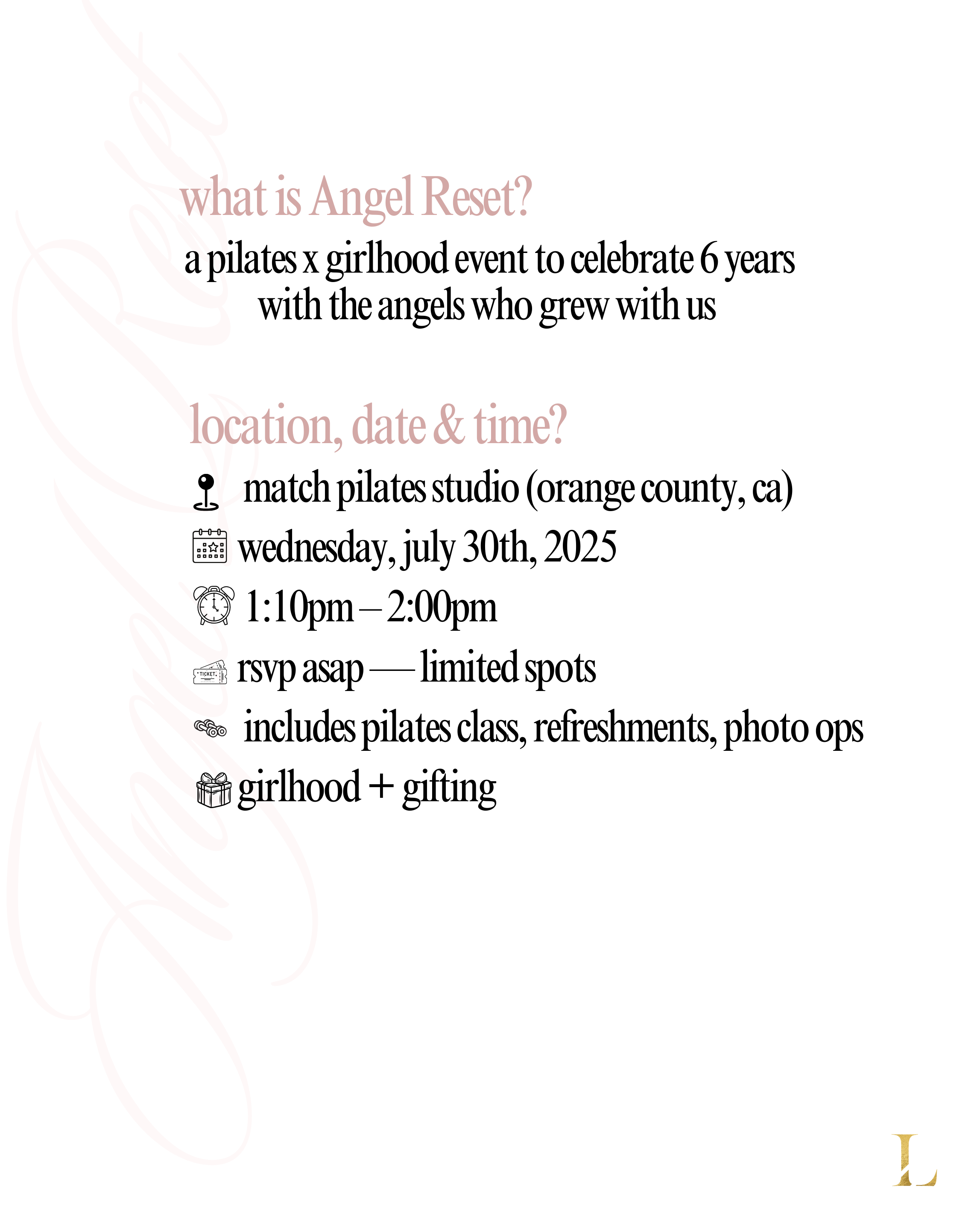 This dreamy pilates event is for the girls who grew with us, supported us, and shaped Lashere into what it is today. Join us for an afternoon of soft movement, sweet memories, and heart-full connections.